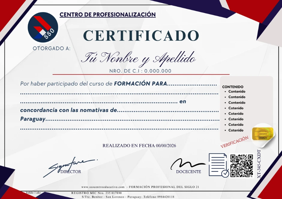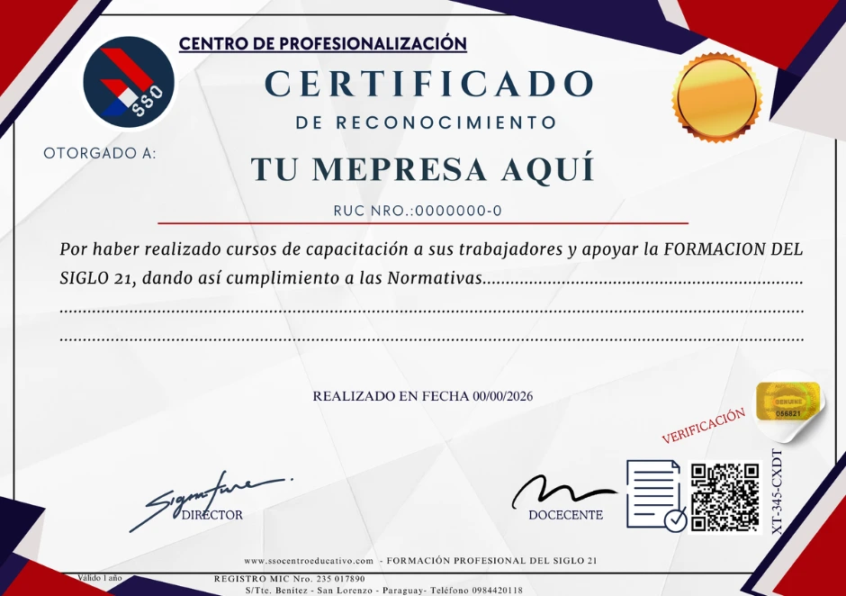 En SSO Centro, entendemos que el conocimiento debe ser acreditable para abrir puertas. Con más de 5 años de trayectoria fortaleciendo la cultura del aprendizaje en Paraguay, emitimos certificados diseñados para cumplir con los estándares de excelencia técnica y normativa. Nuestra trayectoria y la formación constante de nuestros instructores validan las competencias adquiridas tanto por el participante individual como por la empresa, facilitando la auditoría de capacitación y potenciando el perfil laboral en el mercado nacional